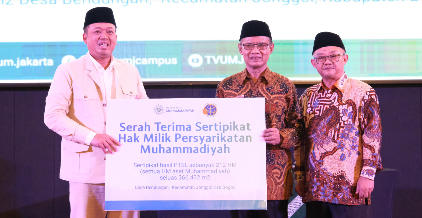 Ketua Umum Pimpinan Pusat (PP) Muhammadiyah, Haedar Nashir, menerima sertipikat tanah dengan total luas aset mencapai 36,6 hektare yang berlokasi di Kabupaten Bogor.